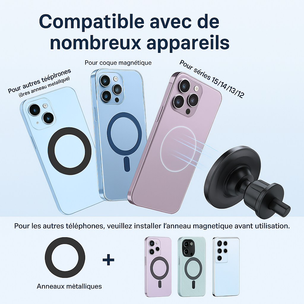Universel pour tous les téléphones, livré avec un anneau métallique supplémentaire, ce support magnétique pour téléphone de voiture convient à tous les téléphones et à la plupart des coques de téléphone ; il suffit de coller l’anneau métallique à l’extérieur du téléphone ou de la coque, l’aimant s’alignera et se fixera automatiquement à votre smartphone sans affecter les signaux, les connexions, etc.