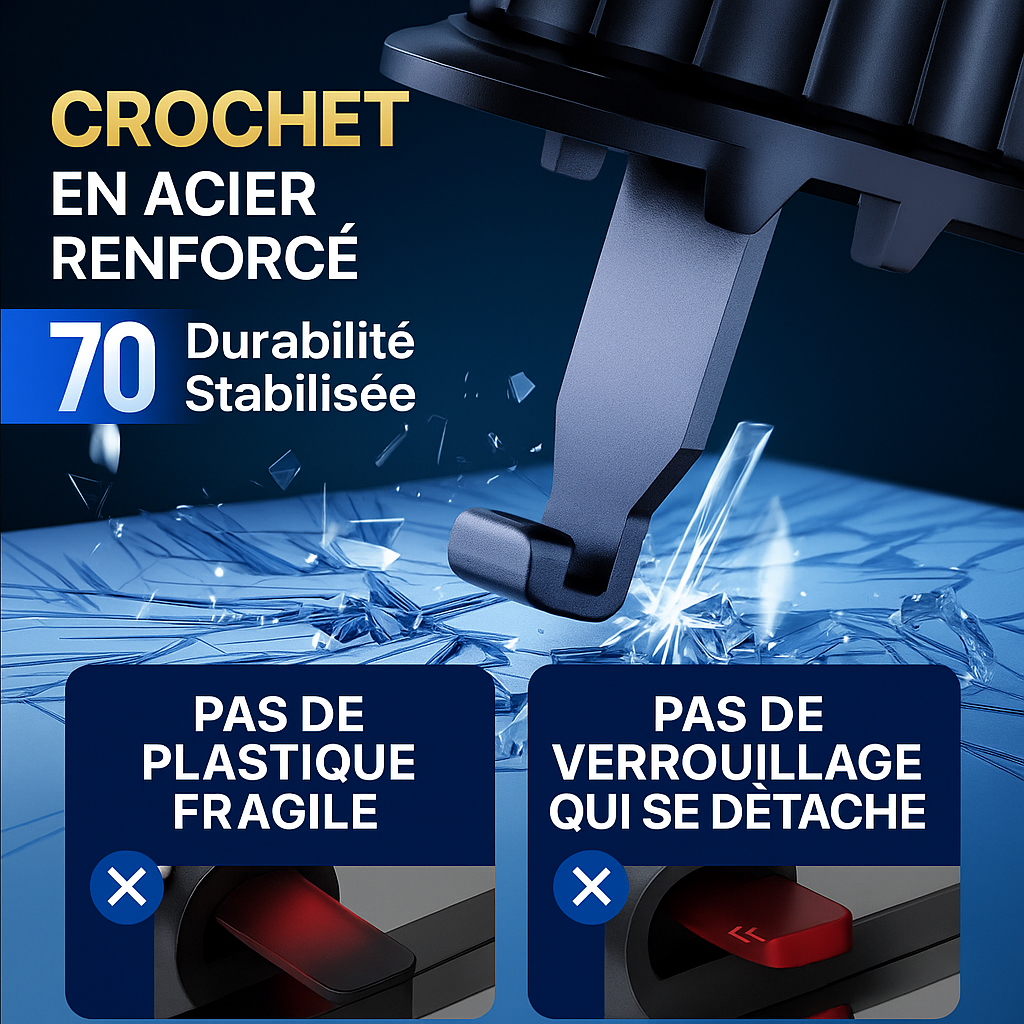 • Conception à crochet sécurisée : Ce support de téléphone de voiture, doté d’un système de fixation à crochet de dernière génération, se fixe solidement aux grilles d’aération. La longueur du crochet est réglable grâce à la molette située à sa base, permettant ainsi de l’adapter à différentes profondeurs de grilles.