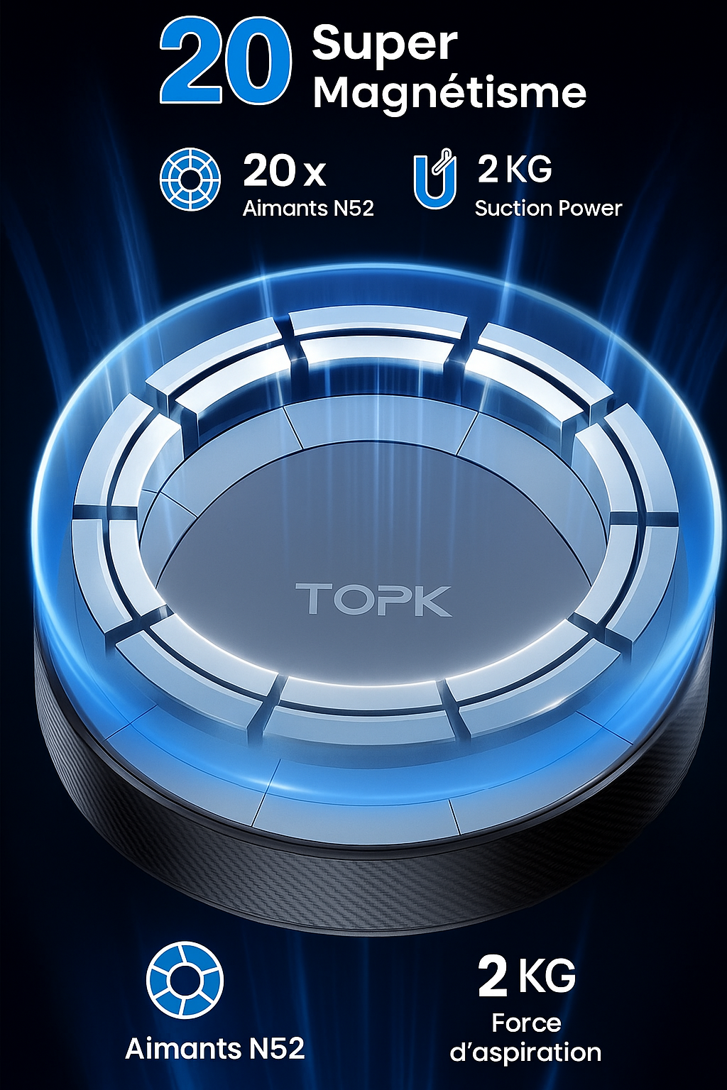 •Force magnétique puissante - Doté de 20 aimants permanents puissants et précisément agencés, le support magnétique pour téléphone de voiture offre une force de serrage plus large et une stabilité accrue, maintenant votre téléphone en place en toute sécurité même sur les routes accidentées.